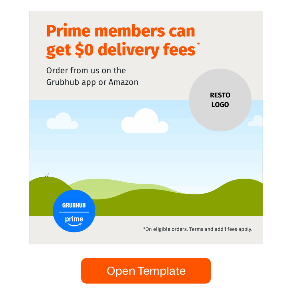 Post with this caption: Prime members can order from [business name] with $0 delivery fees on eligible orders. Visit Amazon or Grubhub to order us for pickup and delivery today! Terms and additional fees apply.