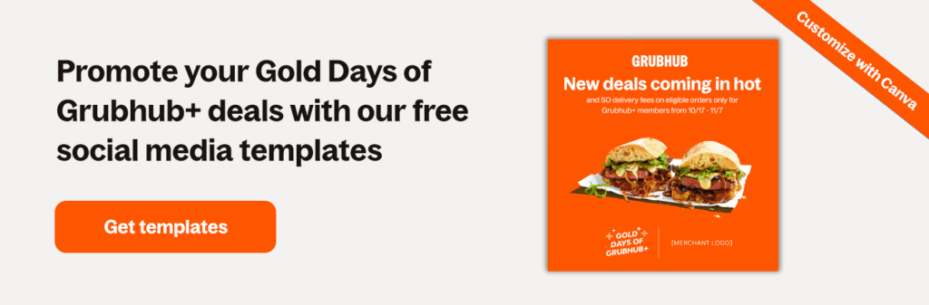 The Gold Days of Grubhub+ event is kicking off on October 21 and running through November 17. Log into your Grubhub for Restaurants account to launch a Gold Days promotion and reach more Grubhub+ customers. Tap into our Gold Days social media template to let your customers know about your exclusive deals.