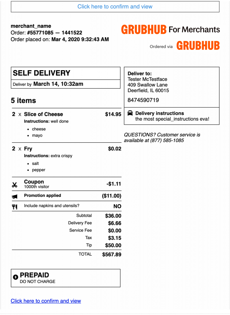 Step 2: Within a few minutes of receiving this email, if you do not click to confirm, you’ll receive an automated call from Grubhub to enter the confirmation number located on the email.